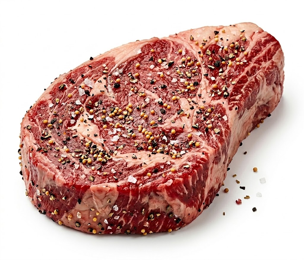 The good stuff! Succulent Ribeye steak lightly rubbed with olive oil and a dusting of black pepper and spices. Salt pack provided to sprinkle on only just before grilling.